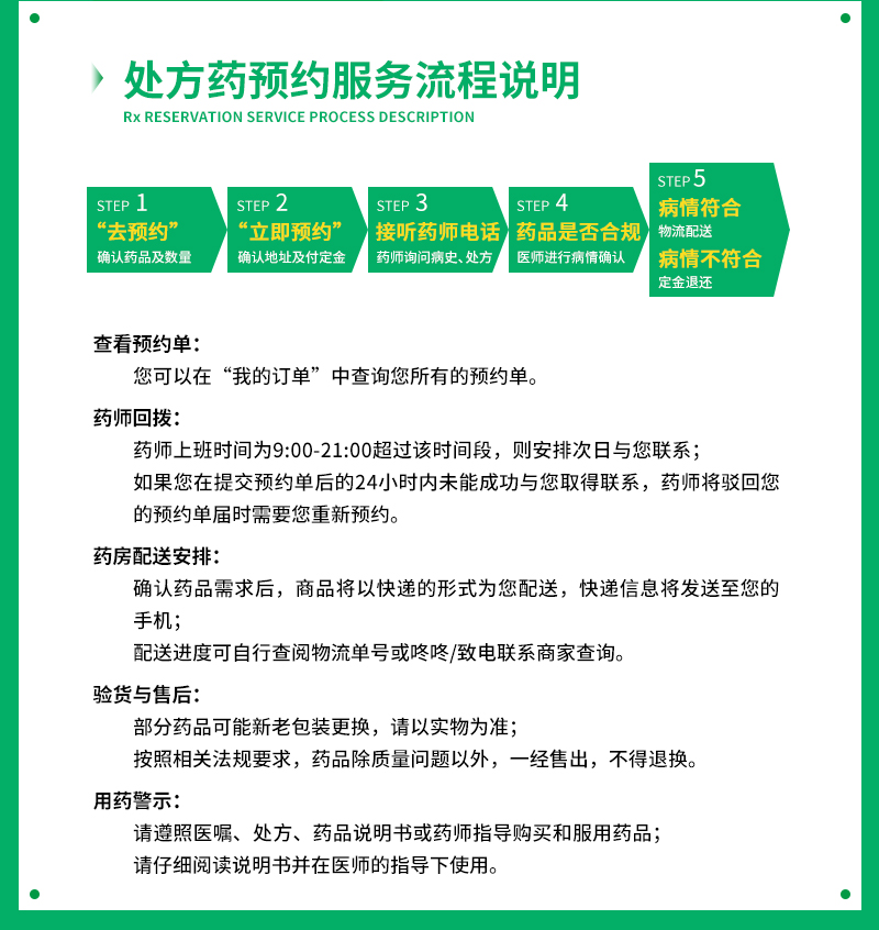 本網(wǎng)站(www.fashione.cn)僅對(duì)網(wǎng)站上入駐藥房(以下簡(jiǎn)稱:藥房)提供的藥品信息進(jìn)行展示,藥品的交易由藥房與用戶線下完成,處方藥類藥品的售后服務(wù)由藥房自行提供,以下為藥房提供的藥品預(yù)約及售后政策、流程: