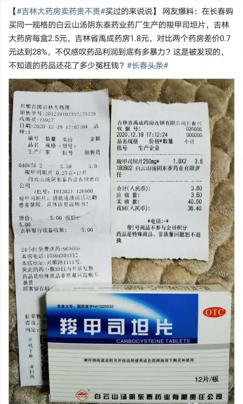 后來發(fā)現(xiàn)有點(diǎn)不對(duì)勁了,去吉林大藥房藥店賣藥的推薦的都是比較貴的藥,普通的感冒要花70-80 甚至上百元,想買的藥卻都說沒有,而且很多藥發(fā)現(xiàn)都貴了很多…