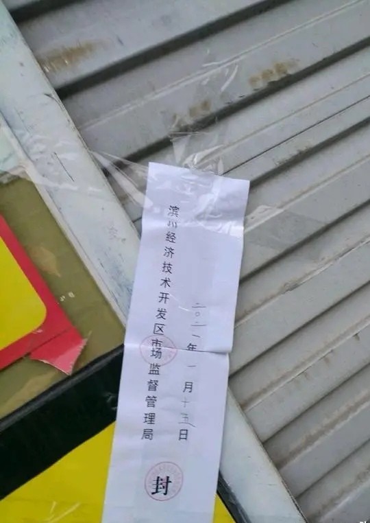 不知道咋回事!走進一看!大門兩側(cè)貼著封條!封條上寫著:2021年1月13日,濱州經(jīng)濟技術(shù)開發(fā)區(qū)市場監(jiān)督管理局.