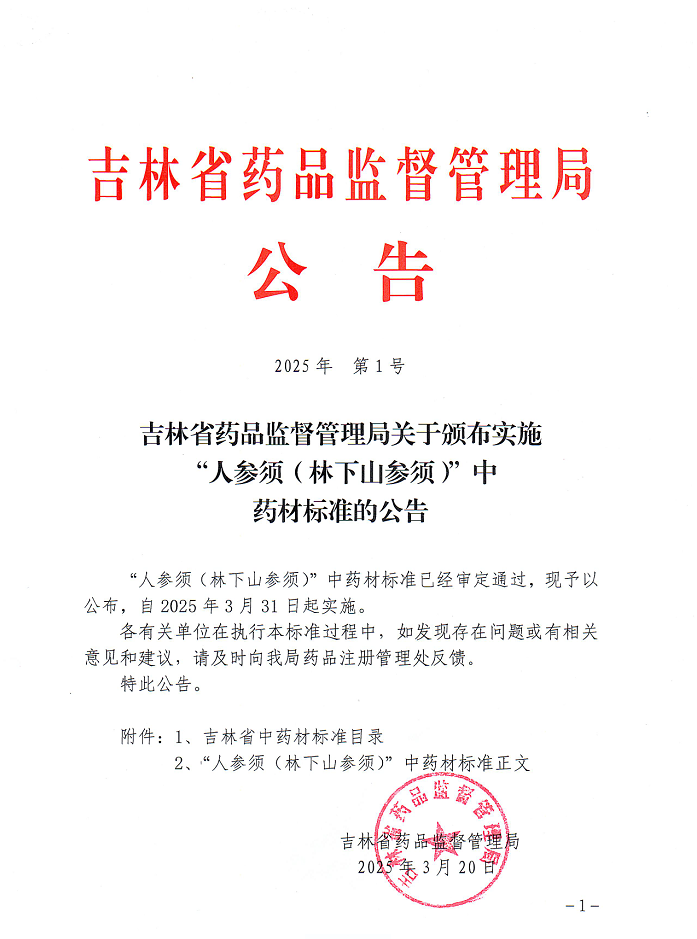 吉林省藥品監(jiān)督管理局關于頒布實施“人參須(林下山參須)”中藥材標準的公告 2025年第1號