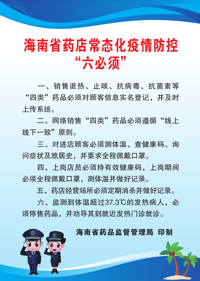 印制《海南省藥店常態(tài)化疫情防控“六必須”宣傳彩頁(yè),通過市縣市場(chǎng)監(jiān)管部門向全省所有零售藥店發(fā)放,要求每家藥店在醒目位置張貼,提醒零售藥店從業(yè)人員嚴(yán)格落實(shí)藥店疫情防控要求,自覺克服麻痹思想、僥幸心理、松勁心態(tài)。同時(shí)讓社會(huì)群眾參與監(jiān)督零售藥店常態(tài)化疫情防控工作,營(yíng)造疫情防控人人有責(zé)的社會(huì)共治氛圍。