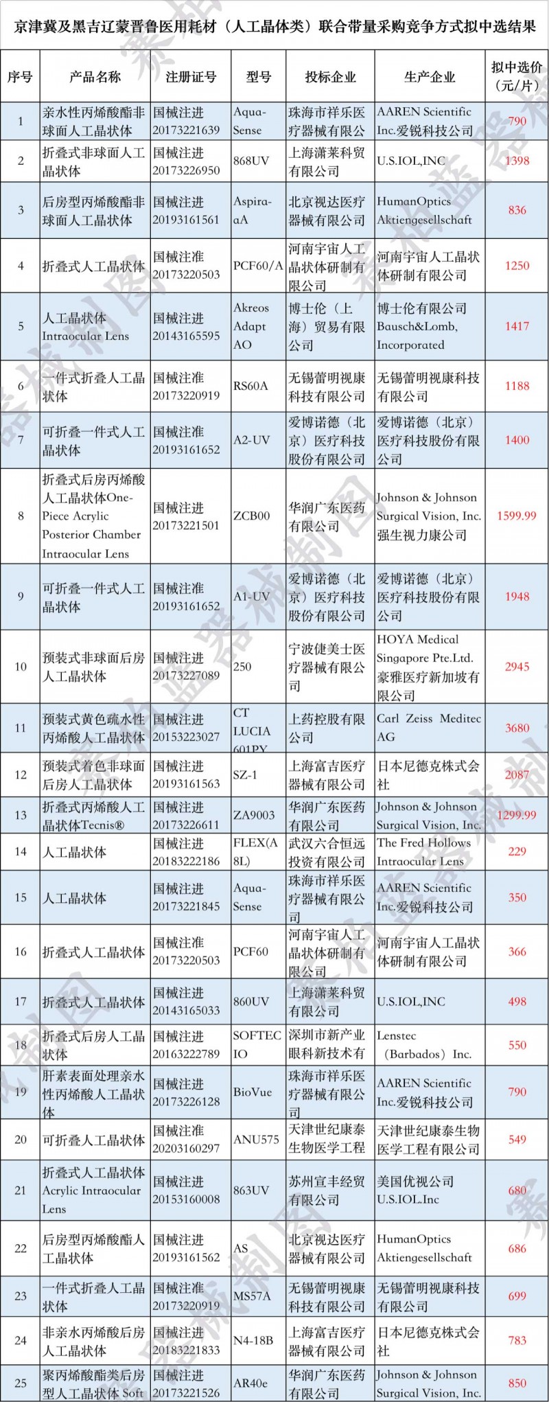 今年5月,京津冀及黑吉遼蒙晉魯醫(yī)藥聯(lián)合采購辦公室公布人工晶體類耗材中選結(jié)果,中選企業(yè)包括強(qiáng)生視力康、愛博諾德、美國愛爾康、無錫蕾明視康等企業(yè)(文末附中標(biāo)企業(yè)及價(jià)格名單)。