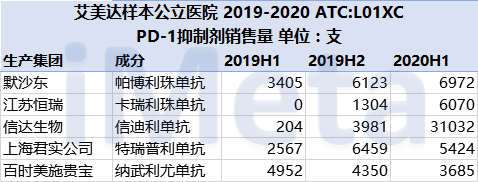 截至目前,在艾美達樣本公立醫(yī)院中,國內已上市6種PD-1抑制劑,2019-2020有銷售數(shù)據(jù)的共5種。