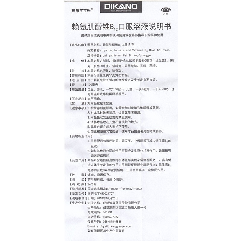 迪康寶寶樂 賴氨肌醇維B12口服溶液100ml 1盒