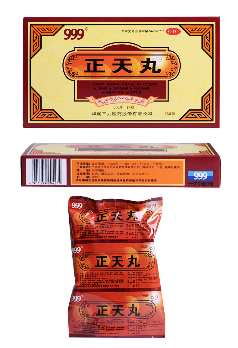 999 三九 正天丸 6g*10袋 1盒 用于外感風(fēng)邪 、淤血阻絡(luò)、血虛失養(yǎng)、肝陽(yáng)上亢引起的偏頭痛、緊張性頭痛、神經(jīng)性頭痛、頸椎病型頭痛、經(jīng)前頭痛