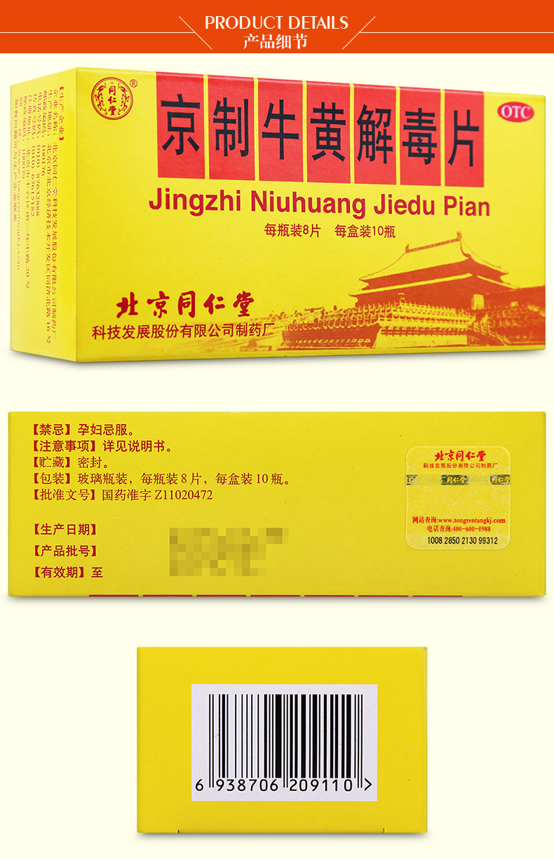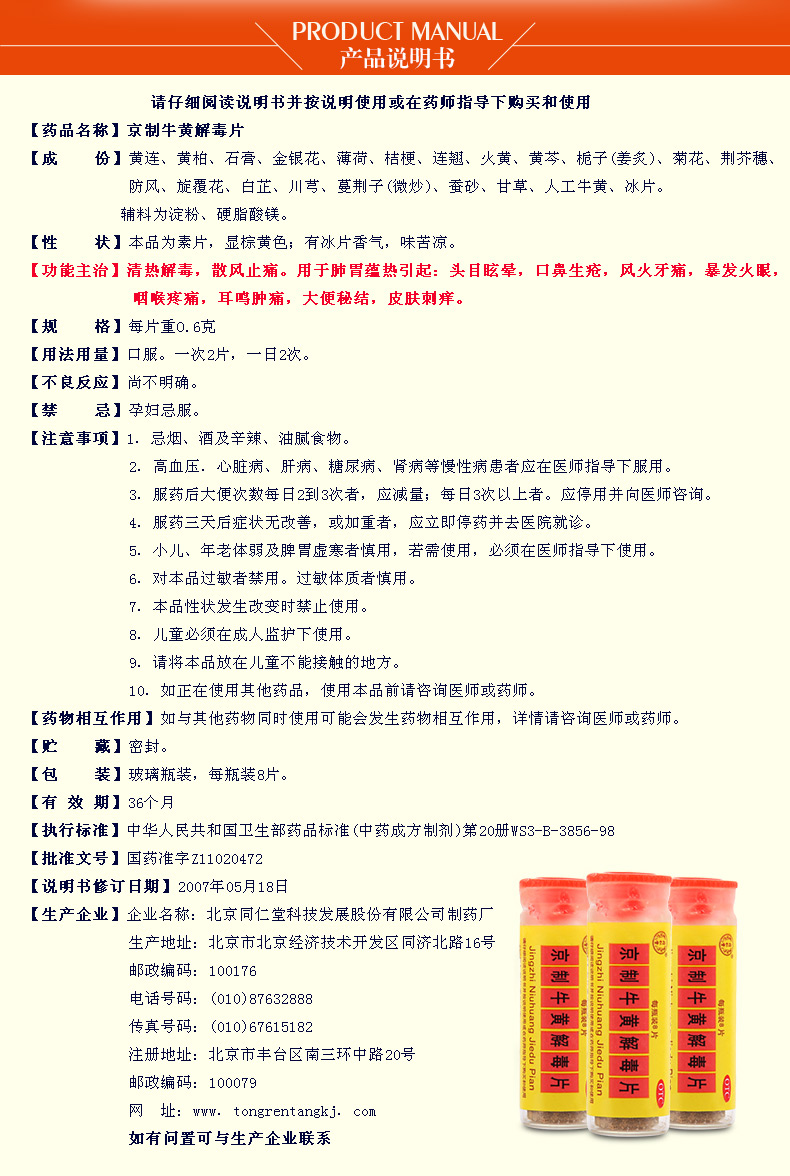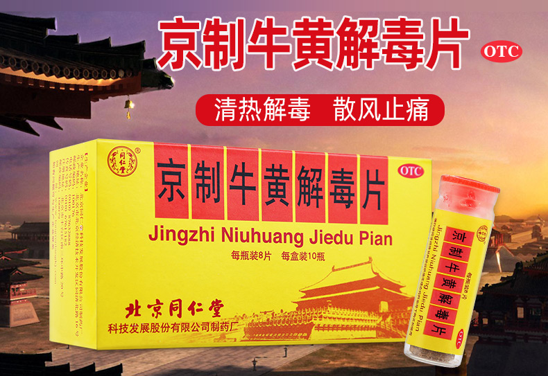 北京同仁堂京制牛黃解毒片0.6g*8片*10瓶清熱解毒 散風(fēng)止痛 口鼻生瘡 大便秘結(jié) 風(fēng)火牙痛