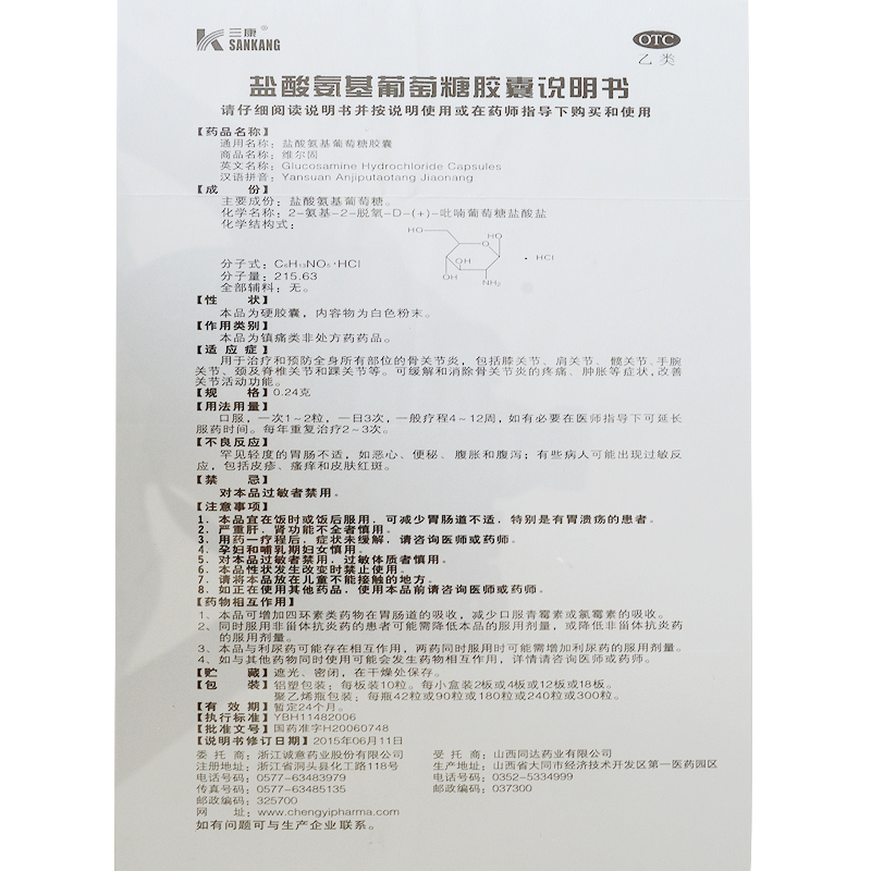 三康 鹽酸氨基葡萄糖膠囊(維爾固)0.24g* 20粒 治療和預(yù)防全身所有部位的骨關(guān)節(jié)炎